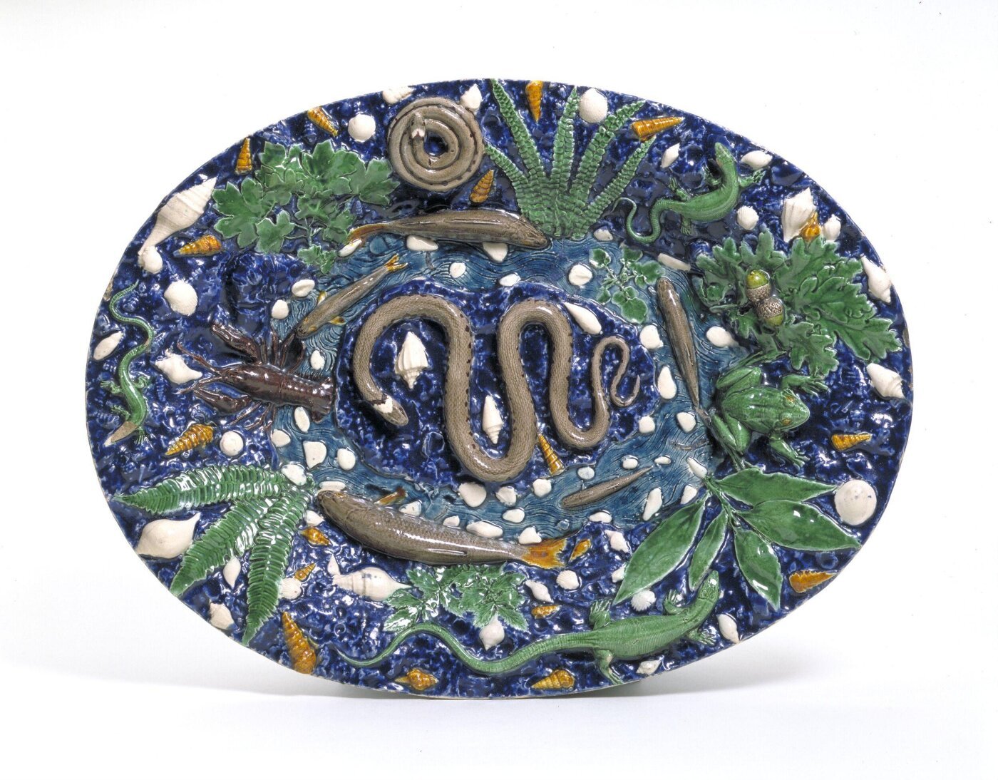 Bernard Palissy (v.1510-1589/1590), célèbre pour être l’inventeur des ‘rustiques figulines’ du roi, crée un œuvre céramique foisonnante de reptiles, de batraciens et de coquillages. Il met en scène un monde animal, végétal et minéral stupéfiant de véracité en utilisant la technique du moulage sur le vif et en maîtrisant les subtilités des glaçures colorées, qu’elles soient transparentes, opaques ou translucides. Les coquillages qu’il a reproduits sont principalement des moulages de mollusques bivalves, notamment des bucardes, des coques (Cerastoderma edule), des pétoncles (Chlamys sp.), des praires (Venus verrucosa). On y trouve également quelques mollusques gastéropodes, tels que des nasses (Nassa reticulata), de petits bulots (Buccinum undatum, le buccin), des natices et murex. Tous ces spécimens étaient disponibles sur la côte rocheuse et sableuse des Charentes, à proximité de son atelier à Saintes. Aucune trace de moulage de fossiles n’est identifiée dans les œuvres attribuées à Bernard Palissy.