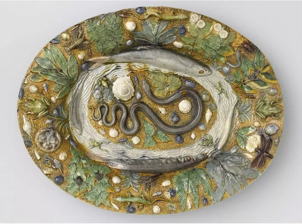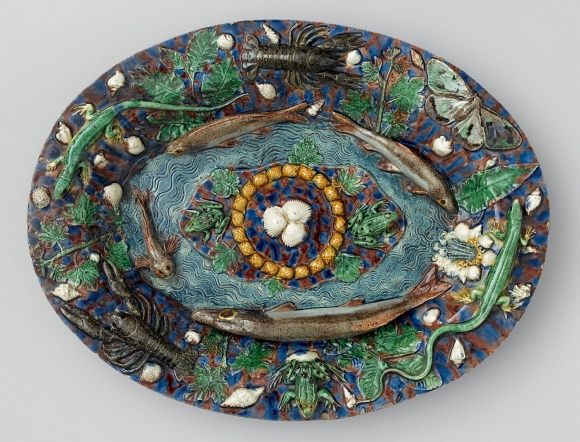 Dans le plats ci-dessus et notamment dans celui conservé par le MET (photo en haut à gauche) des moulages de fossiles Lutétien et Cuisien de l’Eocène du bassin parisien ont été intégrés au milieu de coquillages actuels. Ces moulages présentent des specimens tels que Ancilla, Athleta, Chama, Crommium, Haustator, Clavilithes, Volutilithes, Chryptocorda, entre autres. Les historiens de l’art s’accordent désormais pour attribuer ce genre de production à des ateliers postérieurs à celui de Bernard Palissy.